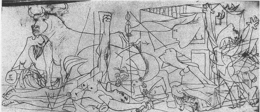 Битов смог создать свой перформенс только потому, что художники двадцатого века обратили взор на процесс становления произведения. В черновиках пушкинского стихотворения и в черновиках «Герники» запечатлелись приключения ищущей, преодолевающей хаос мысли. Отстоявшаяся в эскизах композиция зафиксирована в первом фотоснимке полотна (илл. 72, 73). Фигуры, очерченные черным контуром, хорошо знакомы нам по окончательной версии. Однако отношения между ними иные. На переднем плане выделяется крупная фигура пикадора, лежащего в позе распятого. Кисть его вертикально вытянутой правой руки сжата в кулак, в левой — обломок меча. Это уже не участник корриды, а борец, протестующий перед смертью против насилия. Тело павшего героя придавило ноги лошади, и она, изогнувшись, просительно заглядывает ему в лицо. На заднем плане женщина с мертвым ребенком взывает к быку о помощи. В правой части пока не две, а три женские фигуры. Под той, что лежит на земле, бьется какая-то птица. Женщина у края композиции не падает, а мечется в языках пламени, подпрыгивая и размахивая руками. От нее отлетает другая птица. Мелькание форм, сумятица линий усиливаются пересекающим фигуру треугольником. Такова исходная диспозиция. Ей, по-видимому, соответствуют три карандашных этюда от 13 мая: лицо женщины, глаза которой буквально закатываются на лоб; шестипалая рука, судорожно сжимающая обломок меча; женщина с ребенком, бегущая в отсветах пламени. Поскольку фотографии не датированы, а также в целях краткости изложения, мы будем рассматривать трансформации «Герники» по сквозным вертикалям, прослеживая их ход в отдельных группах от начальной стадии до конечной. Самые сильные преобразования происходят в центре, в группе поверженного воина и лошади. Начав заливку фона, Пикассо перекрывает черной краской и часть фигур таким образом, что теперь кулак поднимается из-за спины лошади. В нем зажаты колосья, которые проецируются на диск, окаймленный лепестками, — цветок подсолнуха или солнце. На следующем этапе, с разрастанием черных участков, фигуры распадаются на фрагменты, рука с колосьями исчезает, а диск сплющивается в форму выпуклой линзы. В ее центре появляется электролампа, от светильника расходятся острые лучи.