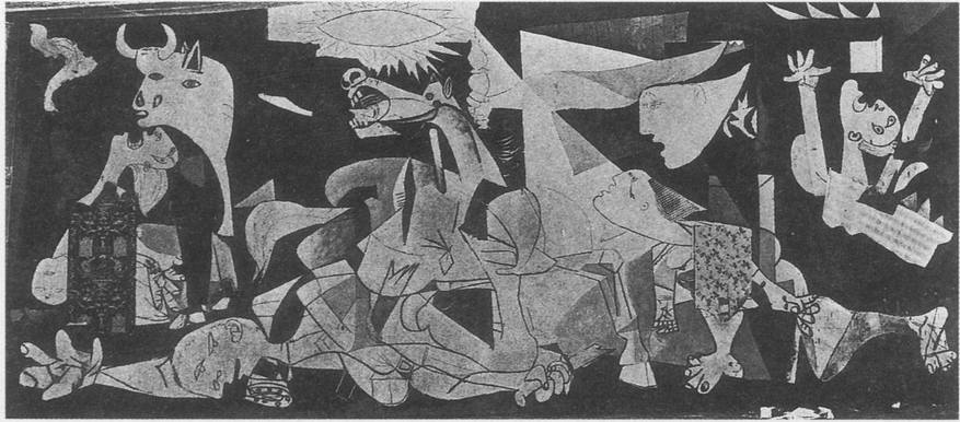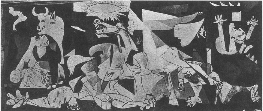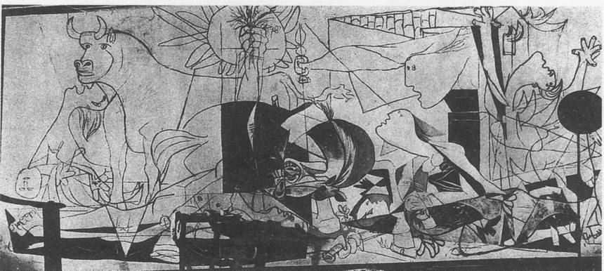 Образы «Герники» выглядят как светотеневые отражения реальности. Сама реальность, цветная и объемная, находится где-то впереди или позади картины и посылает на ее вытянутую по горизонтали поверхность мелькание отсветов и затемнений. В новоевропейской традиции монументальная живопись мыслилась чаще всего как прорыв в стене, открывающий доступ в иной мир — мир исторического прошлого, античной мифологии, средневековых легенд, библейских сказаний, в потусторонний мир божественного бытия. Арочный портал, обрамляющий фресковую композицию, символизировал связь веков и событий, переход от жизни здесь и теперь к бесконечности времени и пространства. Но что такое «прорыв в стене» в современном понимании? Проем окна или двери, так часто встречающийся в станковой живописи Пикассо, открывает лишь фрагмент близлежащего окружения. Ему же нужно было дать концентрированный образ события, свидетелем которого он не был, но о котором знал из сообщений радио и газет. В ту дотелевизионную пору наилучшей моделью «окна в мир» являлся киноэкран. В темноте кинозала, в кадрах хроники представали отблески далеких событий, их движущиеся светотеневые отображения. Художники того времени были очарованы способностью кинематографа к мгновенным перелетам в пространстве, к быстрым сменам ракурсов и планов. Пикассо также проявлял значительный интерес к кино как способу создания «живописного кинезиса» и в пятидесятых годах пытался реализовать его в собственных фильмах.
